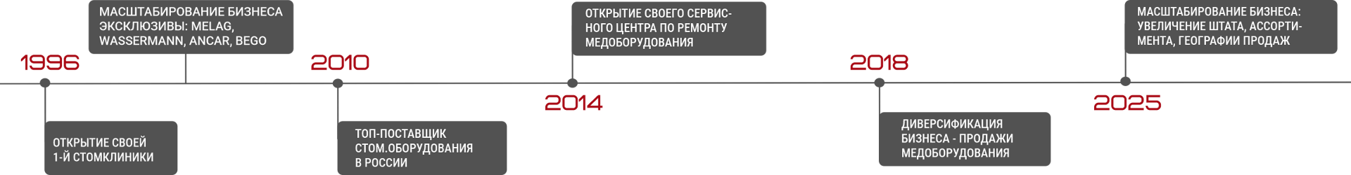 Мы основали компанию в 1996 году и за своими плечами имеем опыт от открытия собственных стоматологических клиник, прямых поставок оборудования и эксклюзивных контрактов на всю Россию до строительства частных клиник и комплексного оснащения государственных лечебных учреждений.